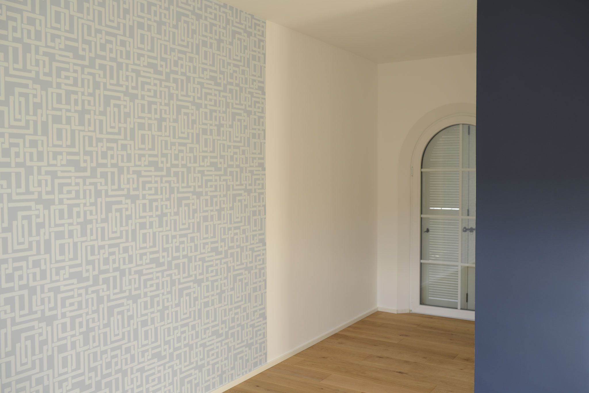 Ausgewählte Tapetenakzente setzen gezielt Highlights und sorgen für eine wohnliche Tiefe. Dabei wurden klassische Muster mit zurückhaltender Farbigkeit kombiniert, um dem ländlich-eleganten Charakter gerecht zu werden, ohne überladen zu wirken.