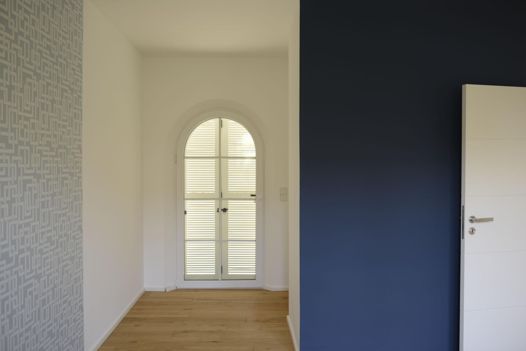 Ziel war es, die architektonischen Gegebenheiten des Hauses mit einer hellen, zeitlosen Gestaltung zu verbinden. Weiße Holzeinbauten – maßgefertigt und klar in der Linienführung – bringen Ruhe und Struktur in die Räume und verleihen ihnen eine moderne Leichtigkeit.