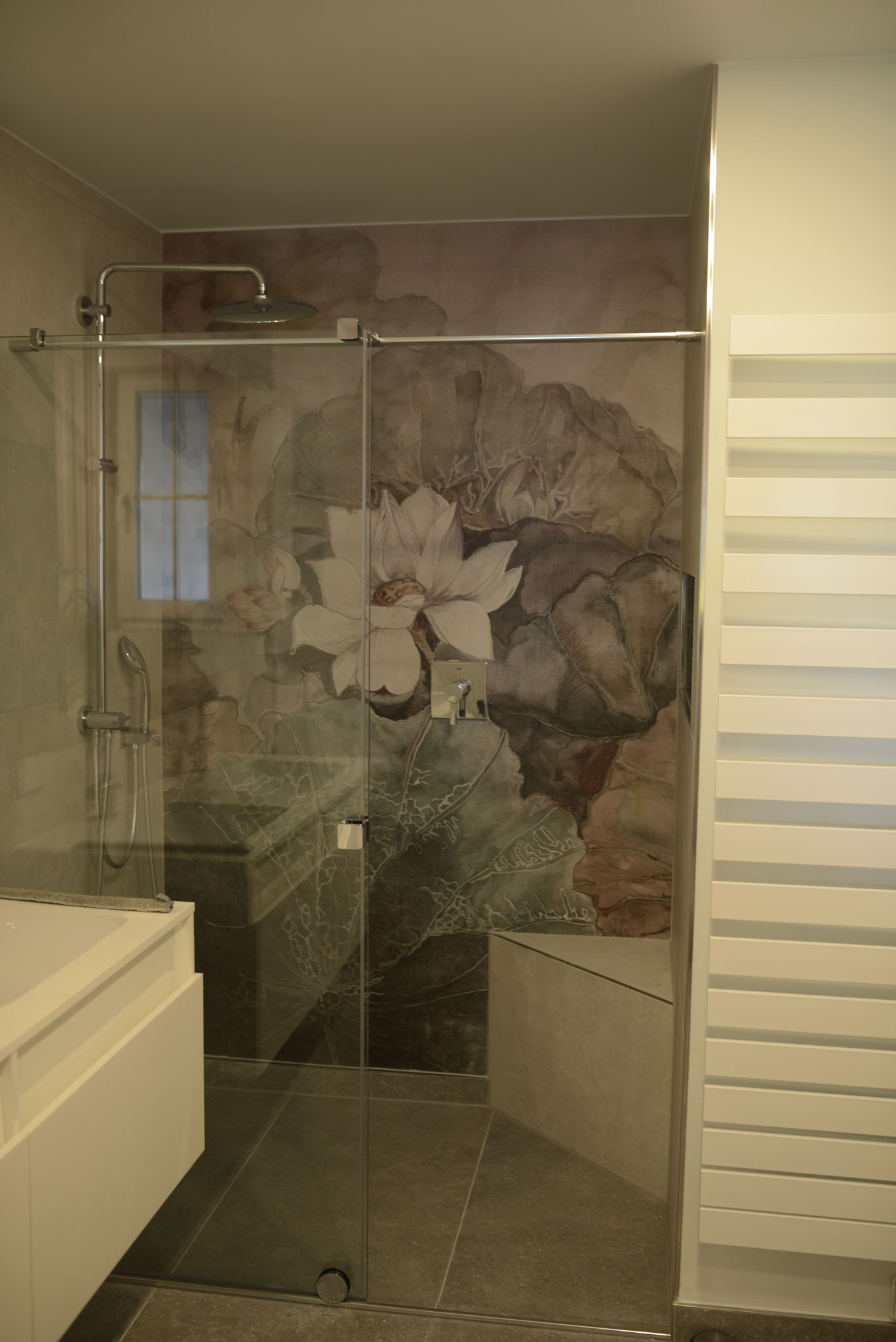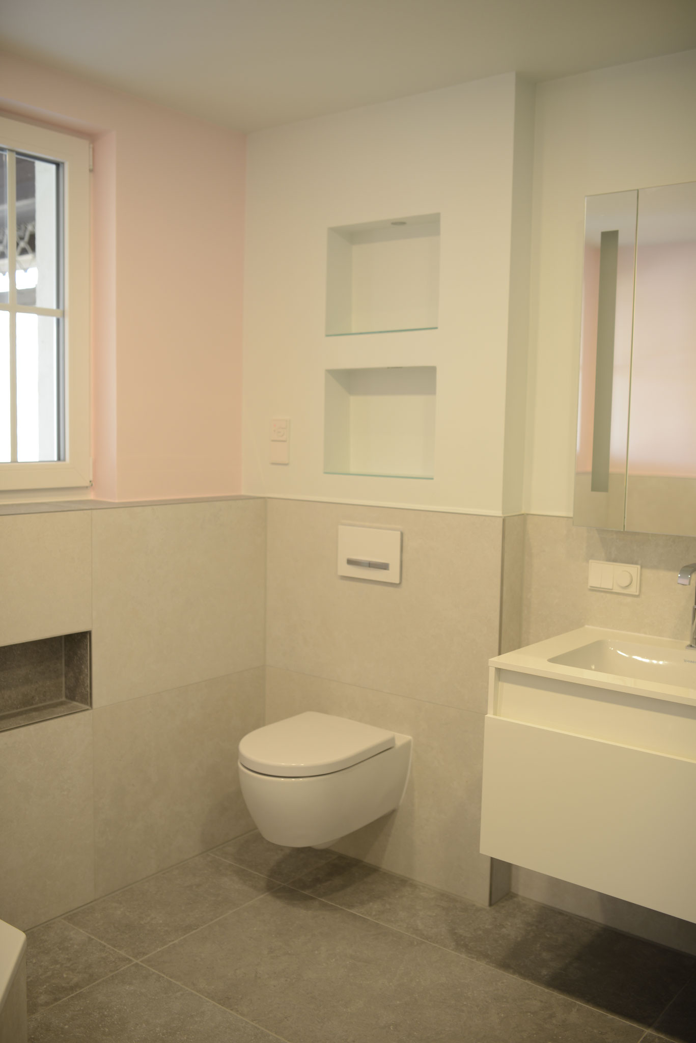Für die Raumteilerwand lag der Fokus auf einer harmonischen Verbindung zur intensiven Optik des angrenzenden Mosaikbades. Die gewählte Farbe aus der Kollektion von Farrow & Ball fügt sich mit einem ruhigerem Grauton stimmig in das Material- und Farbspiel ein, schafft einen ruhigen Gegenpol zur lebhaften Struktur der Mosaikfliesen.
