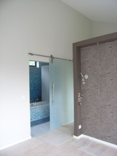 Im Rahmen einer individuellen Farbberatung wurde ein abgestimmtes Farbkonzept für einen zentralen Bereich des Hauses entwickelt: eine Raumteilerwand in der Nähe des Mosaikbades sowie die Rückwand für das Bett im Schlafzimmer.