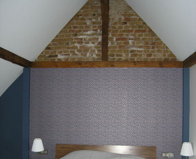 Im Schlafzimmer unter dem Dach wurde die Wand hinter dem Bett mit der eleganten Tapete „Samphire“ von Farrow & Ball gestaltet. Ihre feinen Kupferakzente harmonieren perfekt mit dem Naturstein des oberen Giebels und dem warmen Holz des Bettes. Der blaue Hintergrund der Tapete setzt einen lebendigen Kontrast zur rauen Natursteinfläche und schafft ein spannungsreiches Zusammenspiel von Materialien und Farben.