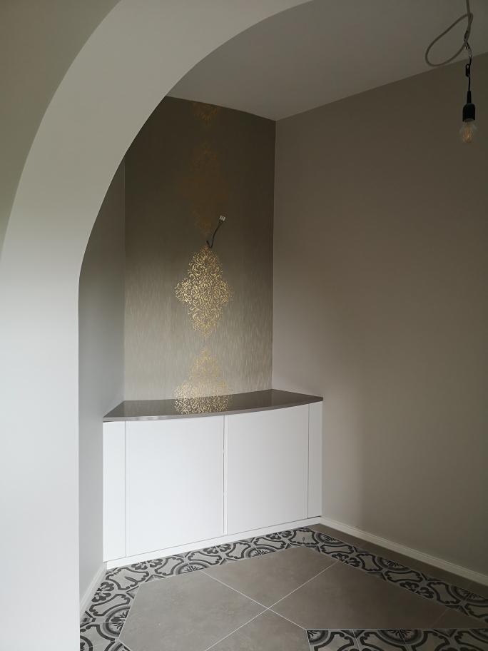 abgesenkt wird. Ein passender Farbton aus dem Tapetendesign wurde für die Wandgestaltung aufgenommen und schafft eine harmonische Verbindung.