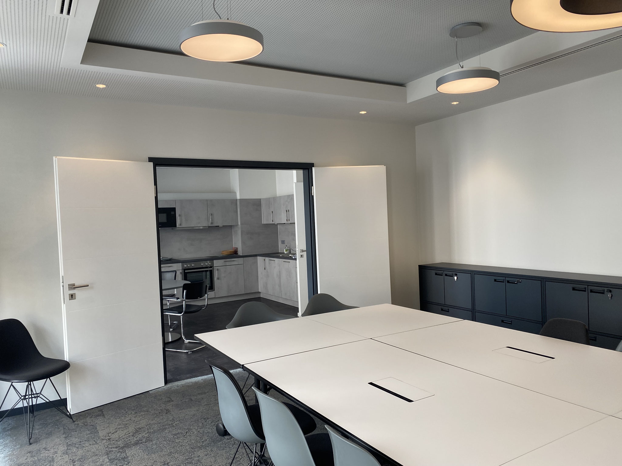 Im Rahmen der Büroerweiterung im 1. Obergeschoss der Main-Taunus-Verkehrsgesellschaft wurde ein moderner Meeting Point mit direktem Zugang zur Personalküche geschaffen. Der Zugang erfolgt über eine doppelflügelige Drehtür, die sowohl gestalterisch als auch funktional in das Gesamtkonzept eingebunden ist.