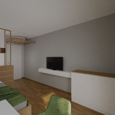Das Ergebnis: ein modernes Jugendzimmer mit klaren Zonen für Schlafen, Ankleiden, Arbeiten und Entspannen – funktional, stilvoll und ganz auf die Bedürfnisse des Jugendlichen abgestimmt.