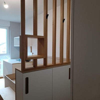 Raumgliederung durch begehbaren Kleiderschrank: Direkt hinter dem Eingang entstand ein begehbarer Kleiderschrank, der durch einen Raumteiler aus massiven Eichenholzlamellen optisch abgeschirmt, aber dennoch offen und luftig wirkt.