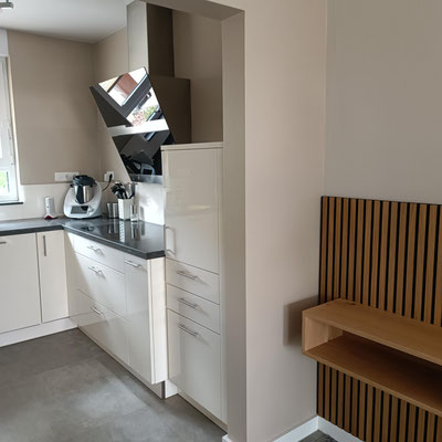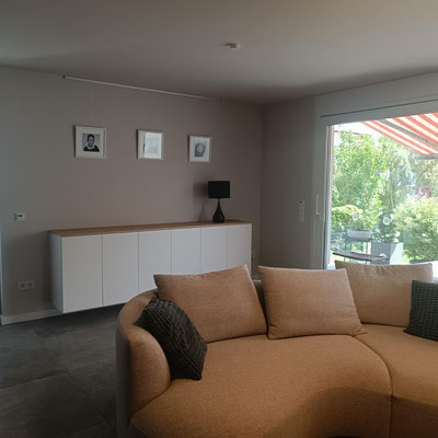 Im Essbereich wurde eine neue, wandhängende Sideboard-Anlage vom Schreiner maßgefertigt – mit viel Stauraum für Geschirr und klarer Linienführung.