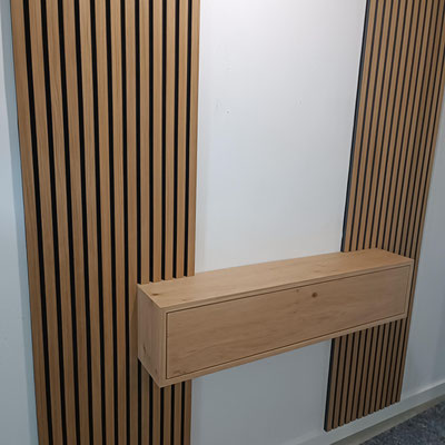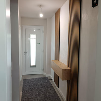 Auch im Flur wurde Funktionalität stilvoll umgesetzt: Ein wandhängendes Board dient als praktische Ablage hinter einer Klappe für Handys, Schlüssel und persönliche Gegenstände – maßgeschneidert für die Bedürfnisse der vierköpfigen Familie.