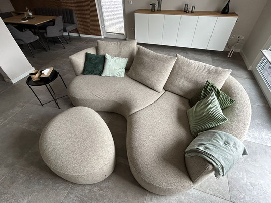Ein neues Sofa vom Modell „Cor Siwa“ wurde von mir vorgeschlagen und frei im Raum platziert. 10 Jahre zuvor hatten wir das Sofa an die Wand gestellt Es schafft Leichtigkeit und bringt neue Dynamik in die Raumwirkung. Ergänzt wird die Sitzlandschaft durch einen maßgeschneiderten Teppich von Object Carpet, der das Ensemble stimmig abrundet.