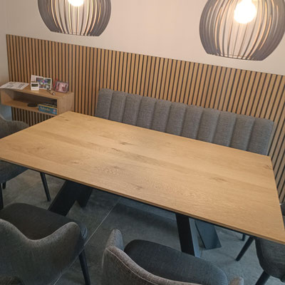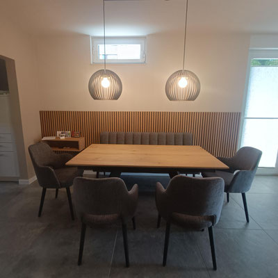 Im Esszimmer sorgt ein Dekorelement aus massiven Eichenholzlamellen an der Rückwand für eine ruhige, strukturierte Atmosphäre. Gleichzeitig schützt es die Wand effektiv vor Stößen – eine ebenso ästhetische wie funktionale Lösung.