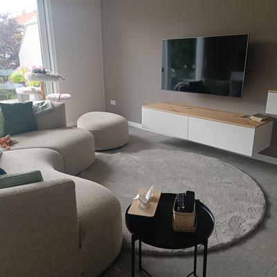 Ein vorhandenes Lowboard erhielt ein Upgrade: Die dunkle Holzplatte wurde durch eine neue Abdeckung aus massiver Eiche ersetzt und das Möbelstück wurde rückseitig zum Sofa hin montiert – funktional und elegant zugleich.